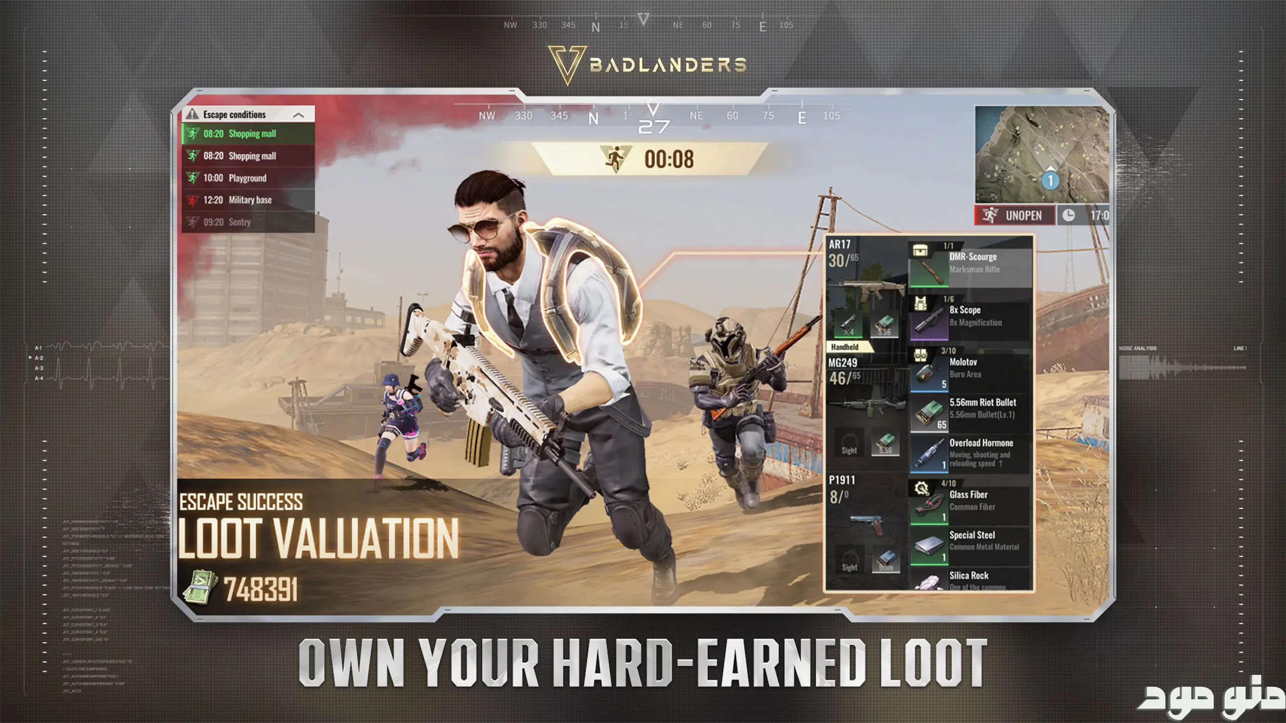 هر قطعه نه تنها روی ظاهر، بلکه بر عملکرد سلاح تاثیر مستقیم می گذارد و این عمق تاکتیکی در انتخاب ترکیب مناسب، یکی از دلایل اصلی جذابیت بازی است.همچنین بازار آزاد درون بازی به بازیکنان امکان می دهد آیتم های خود را بفروشند یا خریداری کنند و نوعی اکوسیستم اقتصادی زنده را شکل دهند که یادآور سیستم های واقع گرایانه ی MMOهاست.بازی از نظر ساختار ماموریت ها نیز کاملا پویاست. علاوه بر نبردهای آزاد، بازیکنان می توانند ماموریت های خاصی را برای کسب پاداش بیشتر انجام دهند. این ماموریت ها معمولا شامل بازیابی آیتم های خاص، شکار دشمنان هدفمند یا استخراج منابع از مناطق خطرناک هستند. هر ماموریت موفق، امتیاز تجربه و منابع ویژه ای به همراه دارد که در ارتقای رتبه و باز کردن تجهیزات جدید موثر است. از طرفی، سیستم فصلی با چالش ها و جوایز اختصاصی، انگیزه ی بازیکنان برای ادامه ی بازی را افزایش می دهد و حس رقابت مداومی در جامعه ی بازی ایجاد می کند.نکته ی تحسین برانگیز دیگر در این بازی، توازن بین تاکتیک و اکشن است.بازی بازیکن را تشویق می کند تا میان سرعت و احتیاط تعادلی دقیق برقرار کند، اگر چه می توان با حمله ی مستقیم دشمنان را از میان برداشت، اما ریسک از دست دادن تمام آیتم ها نیز وجود دارد.در مقابل، بازیکنی که هوشمندانه حرکت کند و تنها در مواقع ضروری درگیر شود، شانس بیشتری برای خروج موفق دارد. این طراحی باعث می شود بازی نه فقط برای علاقهمندان به اکشن سریع، بلکه برای کسانی که به برنامه ریزی و تحلیل موقعیت ها علاقه دارند، تجربه ای کامل و چند وجهی باشد.از نظر تجربه ی کاربری و رابط گرافیکی بازی استانداردی بالا را رعایت کرده است. منوها شفاف، ساده و کارآمد طراحی شده اند،تغییر سلاح، مشاهده ی موجودی و ورود به مسابقه تنها با چند لمس انجام می شود. در عین حال، بازی به صورت مداوم با بهروزرسانی های جدید، محتواهای فصلی، نقشه های تازه و حالت های متنوع تقویت می شود که موجب تداوم جذابیت و تازگی در تجربه ی بازیکنان می گردد.در نهایت، می توان گفت Badlanders نماینده ای شایسته از نسل جدید شوترهای موبایلی است که با ترکیب واقع گرایی، آزادی عمل و اقتصاد درون بازی، مرز بین اکشن و شبیه سازی را از بین برده است. این بازی نه صرفا میدان نبردی برای تیراندازی، بلکه میدانی برای تصمیم سازی، تفکر و استراتژی است. هر نبرد در آن آزمونی برای مهارت، صبر و درک تاکتیکی بازیکن محسوب می شود و موفقیت در آن به معنی تسلط کامل بر محیط، دشمنان و حتی طمع شخصی است. برای بازیکنانی که می خواهند در دنیایی واقع گرایانه و پر هیجان غرق شوند، این اثر تجربه ای است که تا مدت ها ذهنشان را درگیر خواهد کرد.رابط کاربری بازی بدلندرز Badlanders به شکل زیبایی با کنترل و یادگیری آسان و راحت و گرافیک HD حیرت آوری همراه با جلوه های صوتی جذاب و زیبایی و گیم پلی اعتیادآور و سرگرم کننده ای طراحی شد .