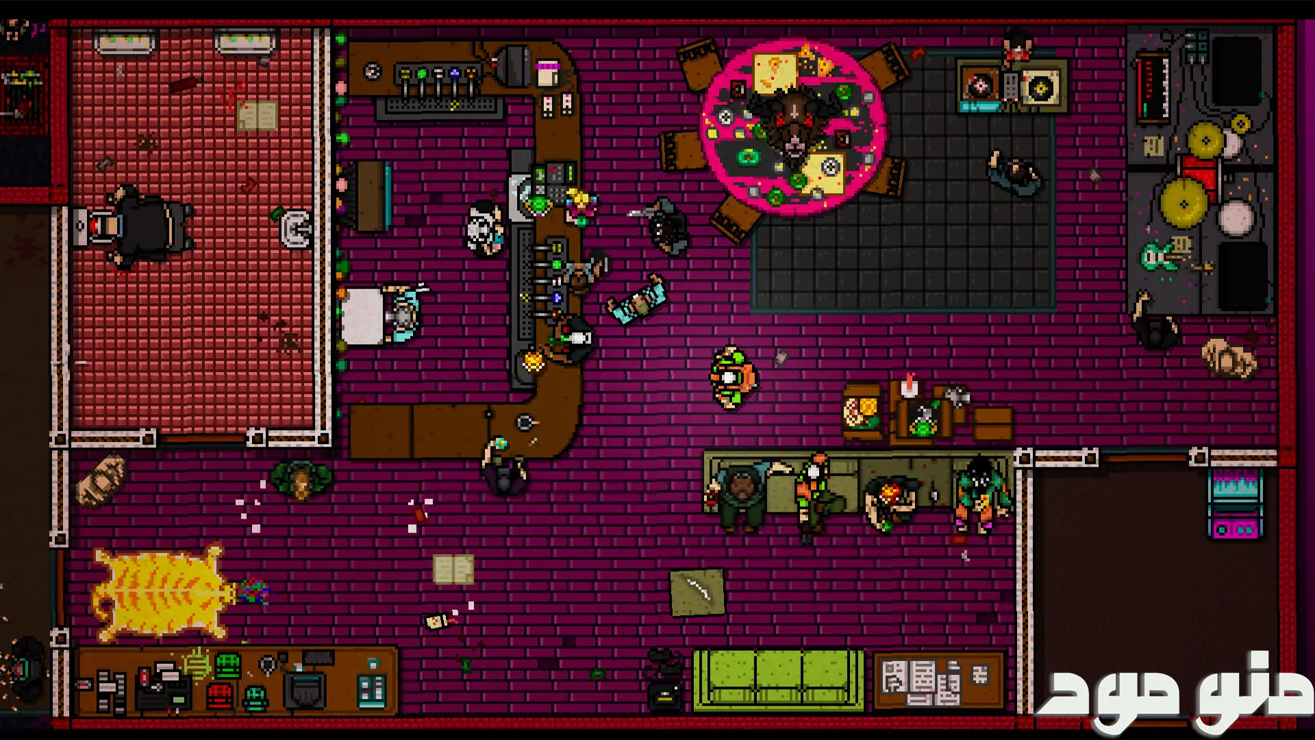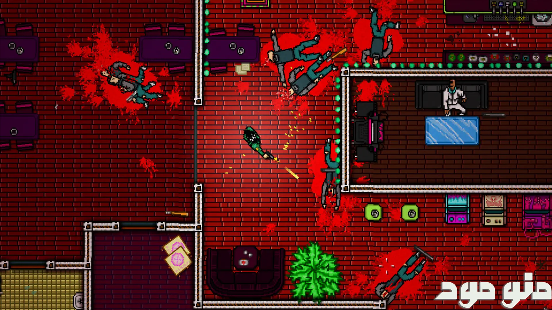 چنین رویکردی باعث شده تجربه بازی از نظر مکانیکی و تاکتیکی غنی تر شود.سلاح ها نقش مهمی در شکل گیری مبارزات دارند و بازی طیف گسترده ای از ابزارهای سرد و گرم را در اختیار بازیکن قرار می دهد. از سلاح های نزدیک برد که نیازمند جسارت و واکنش سریع هستند تا سلاح های دوربرد که امکان کنترل بهتر میدان نبرد را فراهم می کنند، همگی با دقت طراحی شده اند. انتخاب سلاح مناسب در هر موقعیت می تواند مسیر مرحله را به طور کامل تغییر دهد و بازیکن را به سمت سبک بازی تهاجمی تر یا حساب شده تر سوق دهد.طراحی بصری بازی با استفاده از گرافیک پیکسلی و رنگ های تند و متضاد انجام شده است. این سبک هنری خاص، هویت منحصر به فردی به بازی می بخشد و فضای پر تنش آن را تقویت می کند. نورپردازی اغراق شده، رنگ های نئون و جزئیات بصری ساده اما هدفمند، باعث می شود بازیکن به راحتی عناصر مهم محیط را تشخیص دهد و در عین حال در فضای خاص و متفاوت بازی غرق شود. این طراحی بصری نه تنها جنبه زیبایی شناسانه دارد، بلکه به بهبود خوانایی صحنه ها نیز کمک می کند.موسیقی متن بازی یکی از عناصر کلیدی در ایجاد حس و حال کلی آن است. قطعات الکترونیک با ریتم تند و ضرب آهنگ منظم، کاملا با سرعت و خشونت گیم پلی هماهنگ هستند و باعث می شوند هر درگیری حس شدت و فوریت بیشتری پیدا کند. موسیقی در این بازی صرفا یک عنصر پس زمینه نیست، بلکه بخشی فعال از تجربه محسوب می شود که بازیکن را در جریان هیجان مراحل نگه می دارد.ساختار بازی به گونه ای طراحی شده که شکست بخشی طبیعی از روند یادگیری باشد.بازیکن پس از هر بار شکست، به سرعت می تواند مرحله را از ابتدا آغاز کند و با شناخت بهتر محیط و دشمنان، عملکرد خود را بهبود دهد. این چرخه تکرار و پیشرفت باعث می شود حس تسلط تدریجی بر مراحل شکل بگیرد و هر موفقیت ارزشمندتر به نظر برسد.همین ویژگی باعث شده تجربه بازی به شدت وابسته به مهارت و تمرکز بازیکن باشد.در مجموع، Hotline Miami 2: Wrong Number اثری است که بر پایه سرعت، دقت و تنوع طراحی شده و تلاش می کند تجربه ای فشرده، هیجان انگیز و متمایز ارائه دهد.ترکیب گیم پلی چالش برانگیز، روایت چند لایه، طراحی بصری خاص و موسیقی تاثیرگذار، این بازی را به تجربه ای تبدیل کرده که مخاطب را از ابتدا تا انتها درگیر خود نگه می دارد و هر مرحله آن حس تازگی و تنش را حفظ می کند.رابط کاربری بازی هاتلاین میامی 2: شماره اشتباه Hotline Miami 2: Wrong Number به شکل زیبایی با کنترل و یادگیری آسان و راحت و گرافیک HD حیرت آوری همراه با جلوه های صوتی جذاب و زیبایی و گیم پلی اعتیادآور و سرگرم کننده ای طراحی شد .