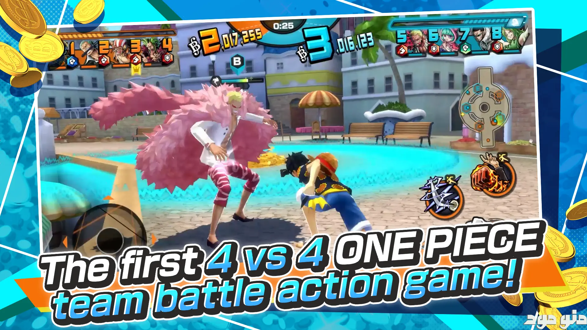 با این حال، هر مسابقه به گونه ای طراحی شده است که بازیکن باید علاوه بر توانایی فردی، همکاری تیمی و مدیریت منابع را نیز در نظر بگیرد تا بتواند به موفقیت دست یابد و بیشترین میزان گنجینه ها را جمع آوری کند.صداگذاری و موسیقی بازی نیز با دقت فراوان انجام شده است، به طوری که هر شخصیت صدای اختصاصی خود را دارد و افکت های صوتی، ضربات و توانایی ها همگی با محیط و اکشن بازی هماهنگ هستند. موسیقی زمینه با شدت و هیجان مسابقه تطبیق دارد و حس حضور در یک میدان مبارزه پر هیجان را تقویت می کند. علاوه بر این، محیط ها و آیتم ها با جزئیات دقیقی طراحی شده اند و هر مکان و هر نبرد، تجربه ای تازه و متفاوت ارائه می دهد که باعث می شود هیچ دو مسابقه ای مشابه نباشند.یکی از ویژگی های برجسته این بازی، تنوع و قابلیت شخصی سازی تیم ها و شخصیت ها است.بازیکنان می توانند شخصیت های مورد علاقه خود را انتخاب کرده، ترکیب تیم را متناسب با استراتژی خود تغییر دهند و از تجهیزات و مدال های مختلف استفاده کنند تا عملکرد تیم به حداکثر برسد.این انعطاف پذیری نه تنها به افزایش هیجان بازی کمک می کند، بلکه باعث می شود بازیکن حس واقعی کنترل و مدیریت یک تیم دزدان دریایی را تجربه کند. هر تیم با ترکیب مناسب از شخصیت ها و استراتژی ها، قدرتی منحصر به فرد پیدا می کند و هر مسابقه چالشی تازه و غیر قابل پیش بینی را به همراه دارد.این بازی با ترکیب اکشن سریع، مبارزات تاکتیکی، جمع آوری شخصیت ها و طراحی بصری جذاب، تجربه ای کامل و سرگرم کننده را برای طرفداران انیمه و بازی های چند نفره آنلاین ارائه می دهد. دنیای وان پیس با تمام شخصیت ها، مکان ها و آیتم های نمادینش به میدان مبارزه آورده شده و بازیکن را در قلب ماجراجویی ها و رقابت های دزدان دریایی قرار می دهد. هر نبرد فرصتی برای سنجش مهارت، همکاری تیمی و استفاده از استراتژی های هوشمندانه است و حس واقعی رقابت و هیجان را به بازیکن منتقل می کند. ارتقای شخصیت ها، جمع آوری آیتم ها و ترکیب تیم ها تجربه ای عمیق و طولانی مدت ایجاد می کند که بازیکن را ترغیب می کند بارها و بارها به میدان بازگردد و مهارت های خود را بهبود بخشد.به طور کلی، ONE PIECE Bounty Rush ترکیبی از دنیای انیمه ای محبوب، اکشن سریع، تاکتیک های تیمی، ارتقا شخصیت ها و طراحی بصری و صوتی جذاب است که می تواند ساعت ها بازیکنان را سرگرم کرده و حس واقعی یک ماجراجویی دزدان دریایی را منتقل کند. این بازی نه تنها برای طرفداران سری وان پیس، بلکه برای علاقهمندان به بازی های اکشن و چند نفره آنلاین نیز تجربه ای بی نظیر و هیجان انگیز ارائه می دهد، جایی که هر تصمیم، هر حرکت و هر انتخاب در میدان نبرد اهمیت دارد و موفقیت در بازی به ترکیبی از مهارت، استراتژی و همکاری تیمی بستگی دارد.رابط کاربری بازی نبرد دزدهای دریایی ONE PIECE Bounty Rush به شکل زیبایی با کنترل و یادگیری آسان و راحت و گرافیک HD حیرت آوری همراه با جلوه های صوتی جذاب و زیبایی و گیم پلی اعتیادآور و سرگرم کننده ای طراحی شد .